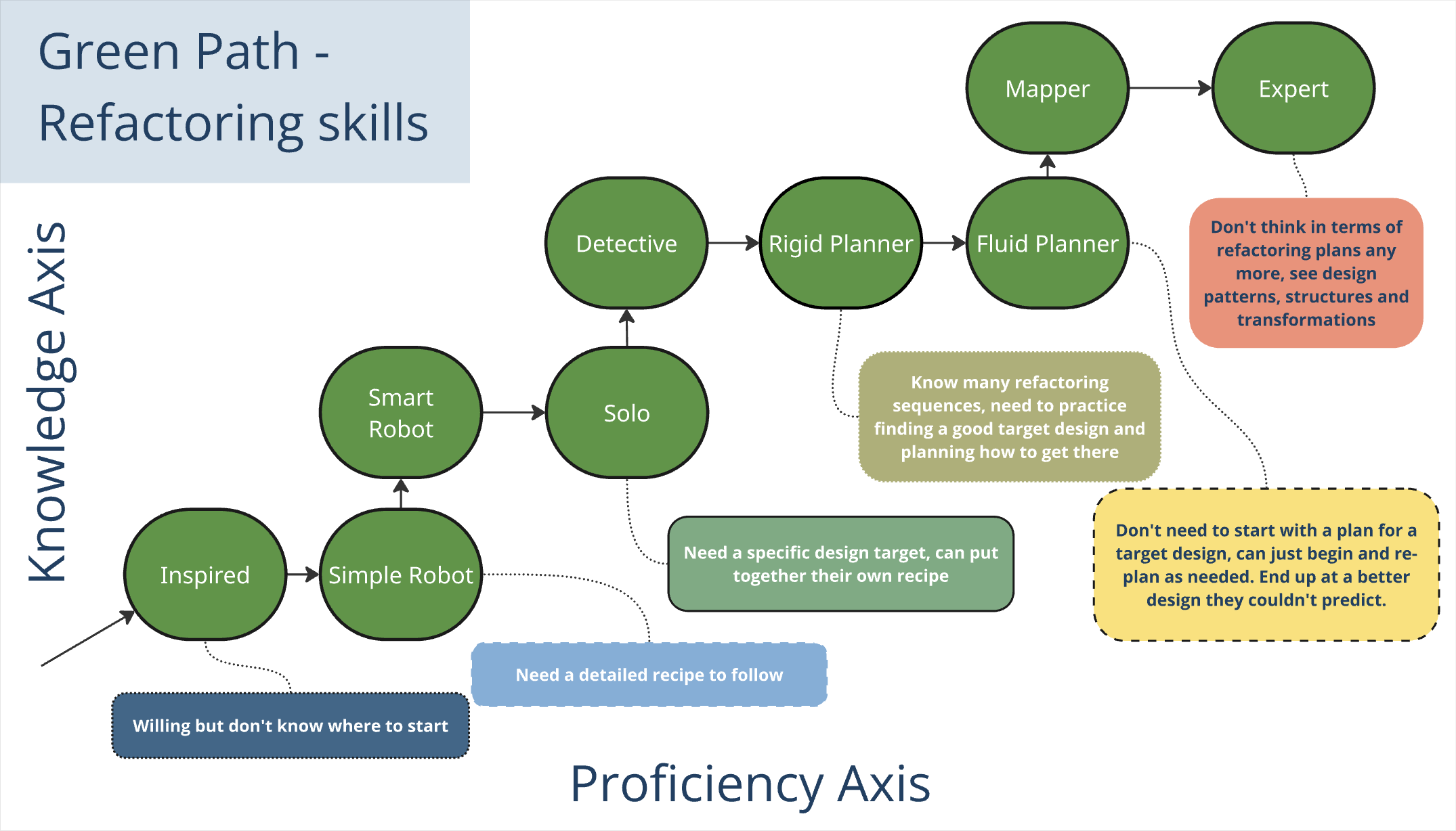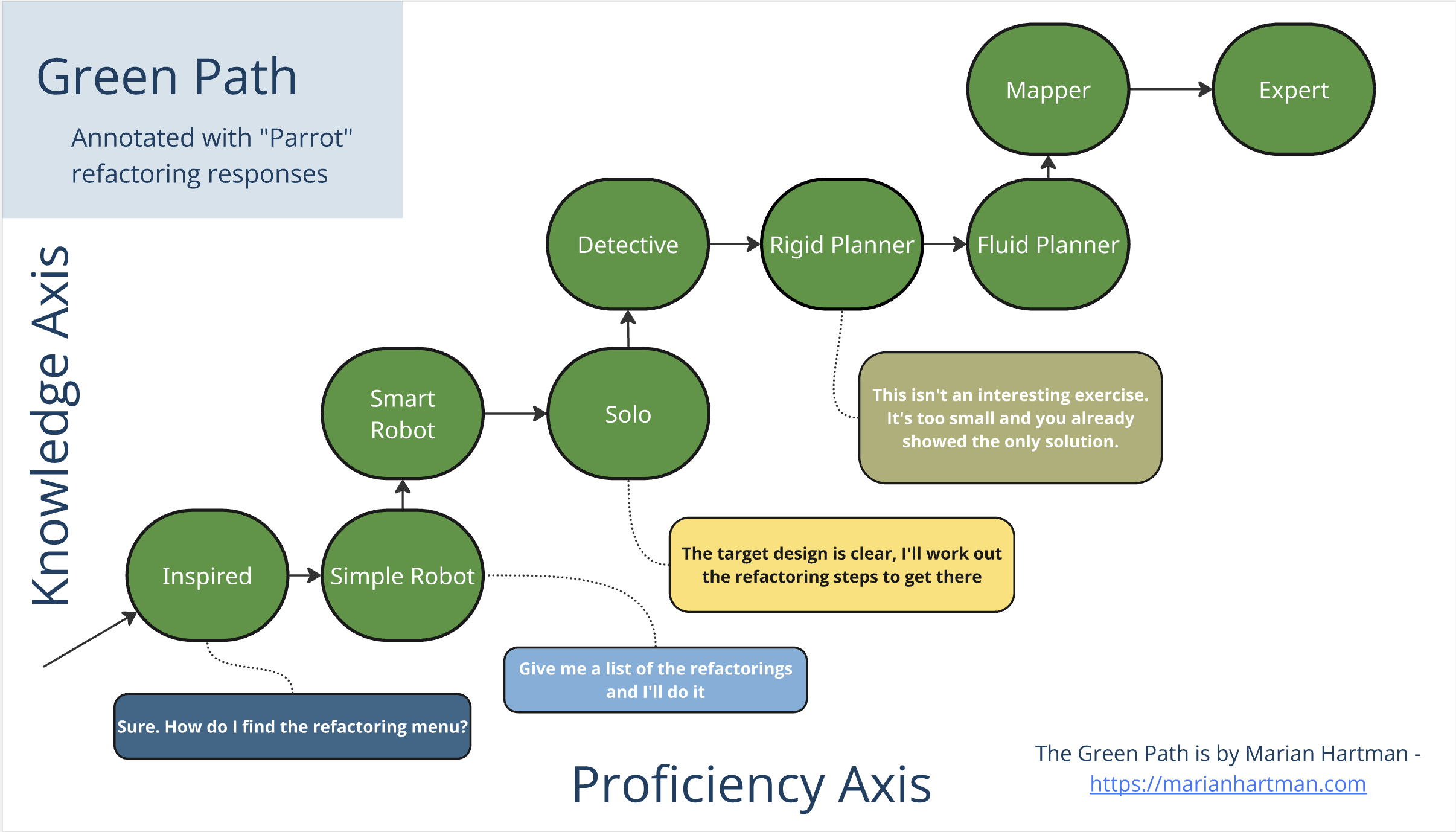 Each of these responses maps to a level of proficiency on the Green Path. Self-assessment is notoriously difficult, probably because you don’t know what you don’t know, but I’m expecting most of my readers to be technical coaches and fairly advanced with refactoring skills already. If you’re coaching a team, these are the kinds of responses you can look out for to make a quick assessment.