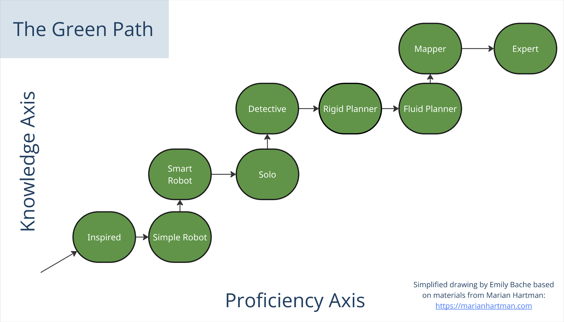 Recently, learning about Marian Hartman’s Green Path model has really helped me to understand what is going on and in particular how I can adapt my materials to the needs of the people I’m coaching. The Green Path is a model to explain the learning journey you go through as you acquire a practical skill like refactoring. The rest of this post is me sharing my current understanding of how I can get better results from the time I spend teaching and coaching.