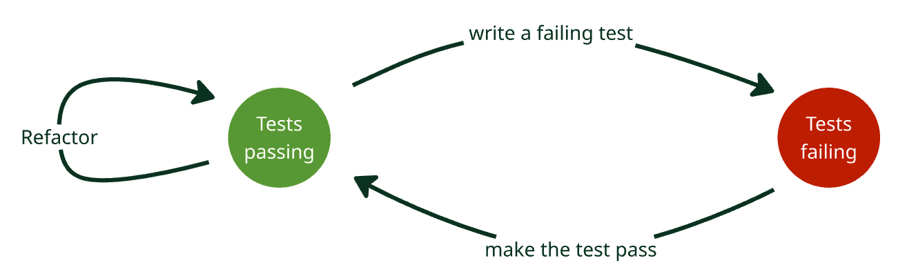 In classic TDD, we talk about three actions: write a failing test (red), write the code to make it pass (green), then refactor. There is a picture of this at the top of the article. If you think about it as a state diagram instead though, there are two states: tests passing, and tests failing. It takes a ‘red’ and a ‘green’ action to get back to passing tests, so together they make a step (aka increment). Each ‘refactor’ action is also a step, so a TDD cycle is actually a red/green step followed by one or more refactor steps.